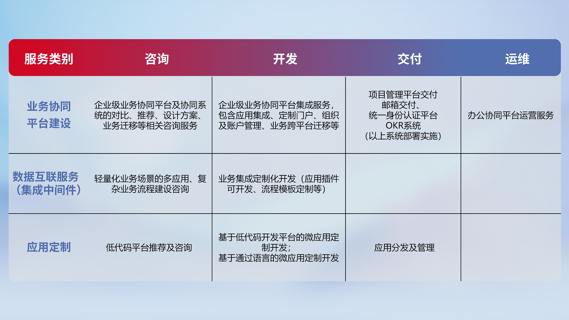 针对钉钉、、、企微、、、IDaas等平台级产品提供产品的规划、、、方案、、、交付、、定制化开发等服务,,实现如统一协同办公、、、智能客户服务、、、混合会议管理、、智能数据查询、、、、等业务场景,,实现数字化转型。。。。