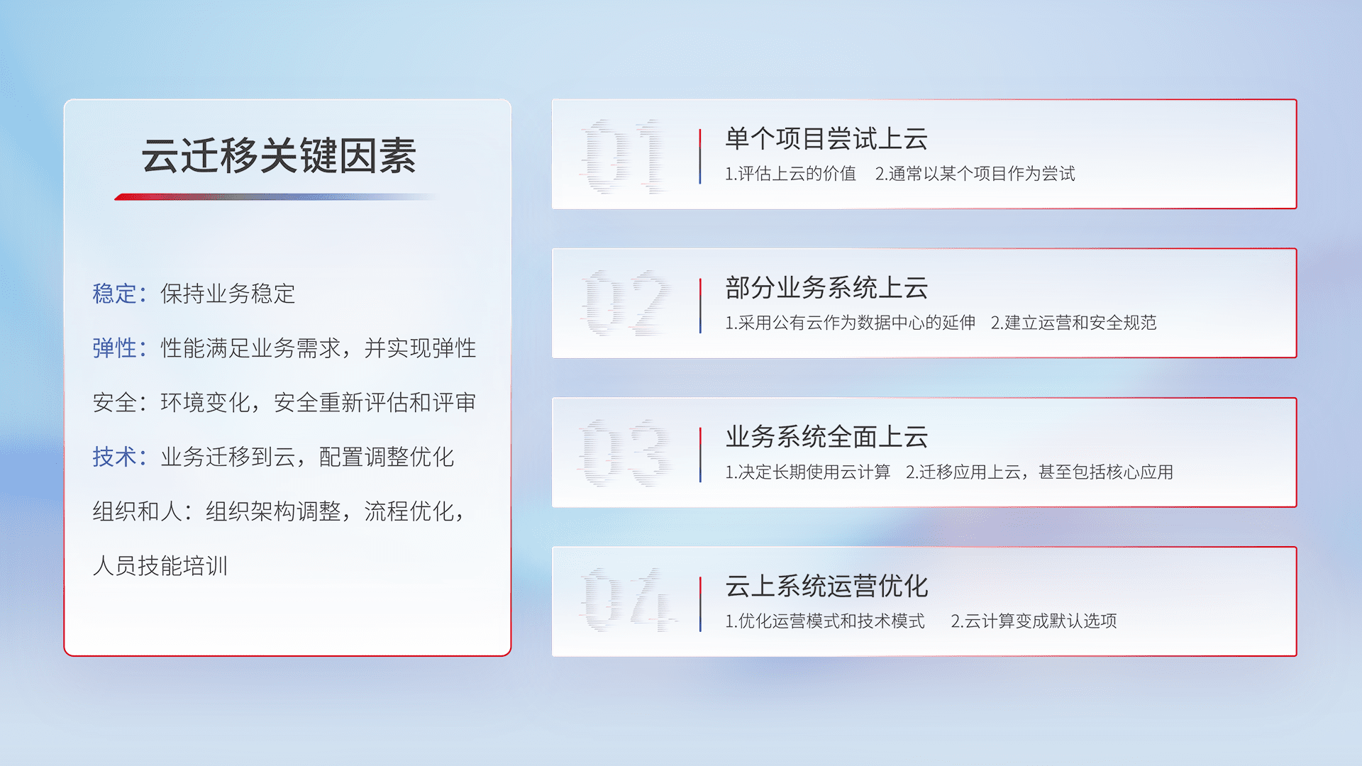 结合实际业务,,,,从规划设计、、、、云平台选型、、、、云原生改造、、、数据迁移、、、、集成交付,,迁移全过程为客户识别最佳上云路径,,,,做好风险识别管理,,,设计网络架构、、、身份权限、、、安全审计合规、、、、操作审计、、、、日志审计、、、、监控告警策略、、、多站点容灾设计等,,对云上基础设施进行整体规划,,提升IT治理水平,,,,以满足弹性、、、、高可用、、、高性能的需求。。