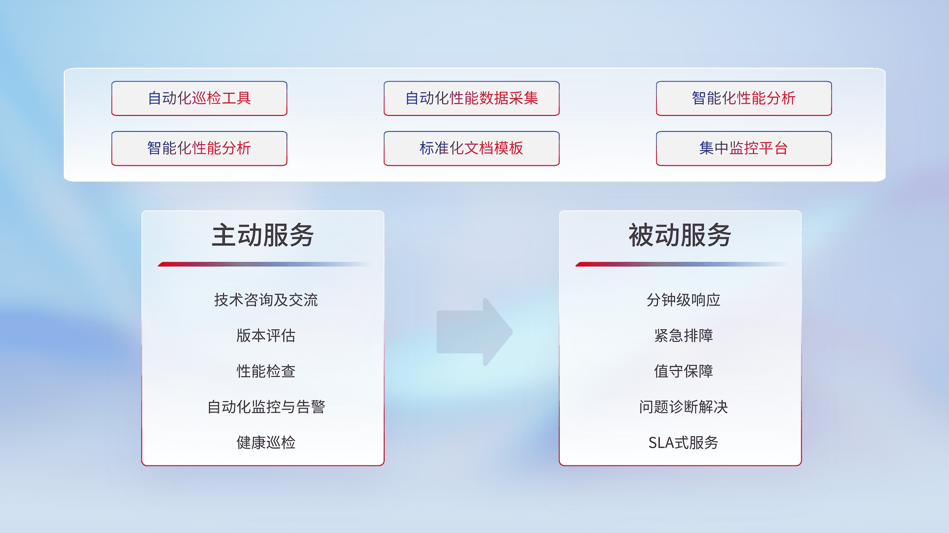 智能化工具和标准化文档,,,保障服务质量,,,,提供主动服务(包含技术咨询、、版本评估、、、性能检查、、、自动化监控与告警、、健康巡检)和被动服务包含(分钟级响应、、、、紧急排障、、、、值守保障、、、、问题诊断解决、、、SLA服务)。。